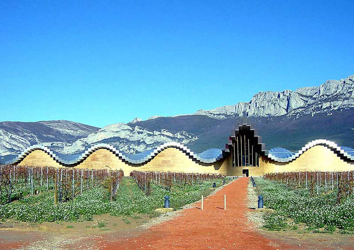 Nestled in the Rioja Alavesa wine region, this award-winning winery designed by Santiago Calatrava features a stunning undulating roof made of precast concrete, blending harmoniously with the surrounding landscape.
